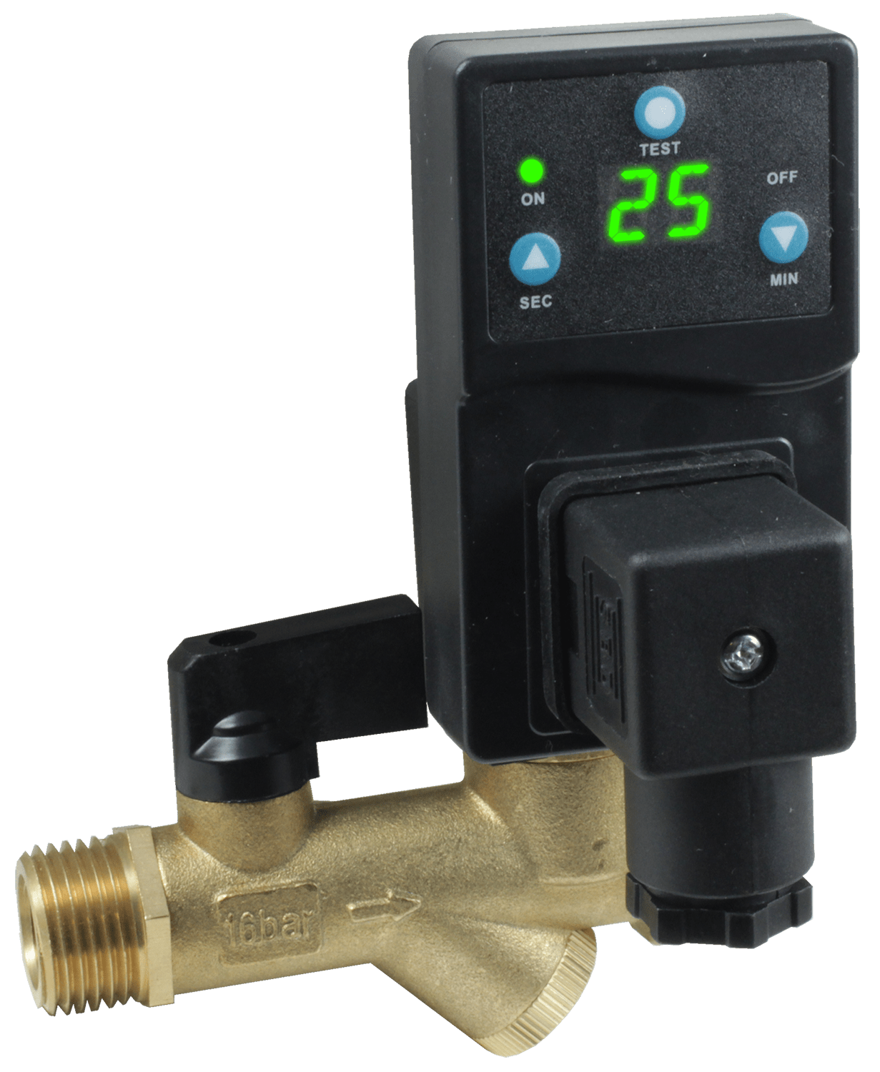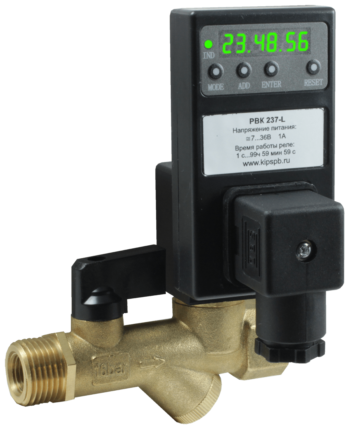 - Клапан укомплектован ручным краном, грязевым фильтром и реле времени РВК с возможностью задания времени: