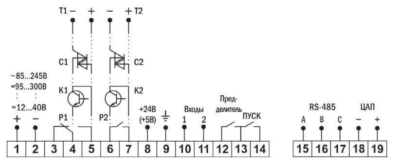 - 2 логических управляющих выходных устройства (14 вариантов логики управления): реле, оптосисмистор, оптотранзистор, твердотельное реле