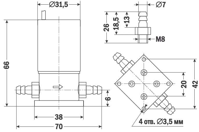 | Присоединение | Резьбовое M8 или 2 штуцера ∅ 7 мм