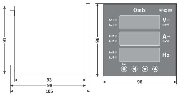 Мультиметр однофазный щитовой с 3 релейными выходами Omix P99-M(AVF)-1-0.5-3K предназначен для измерения и индикации электрических параметров однофазной сети переменного тока – силы тока, напряжения и частоты
