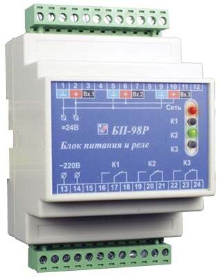 Блок питания и коммутации БП98Р предназначен для преобразования сетевого напряжения в стабилизированное постоянное напряжение =24 В и преобразования трех сигналов «открытый коллектор NPN» в выходы электромагнитных реле «сухой контакт», или в выходы симисторных оптопар, или в выходы оптотранзисторов