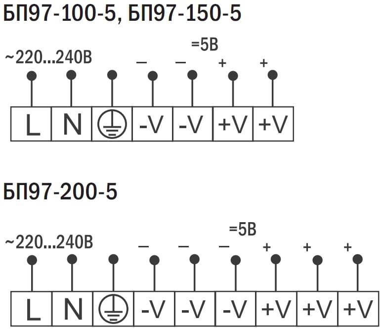 Блоки питания однофазные БП97-100-5, БП97-150-5, БП97-200-5 для преобразования сетевого напряжения в стабилизированное напряжение =5 В Особенности: