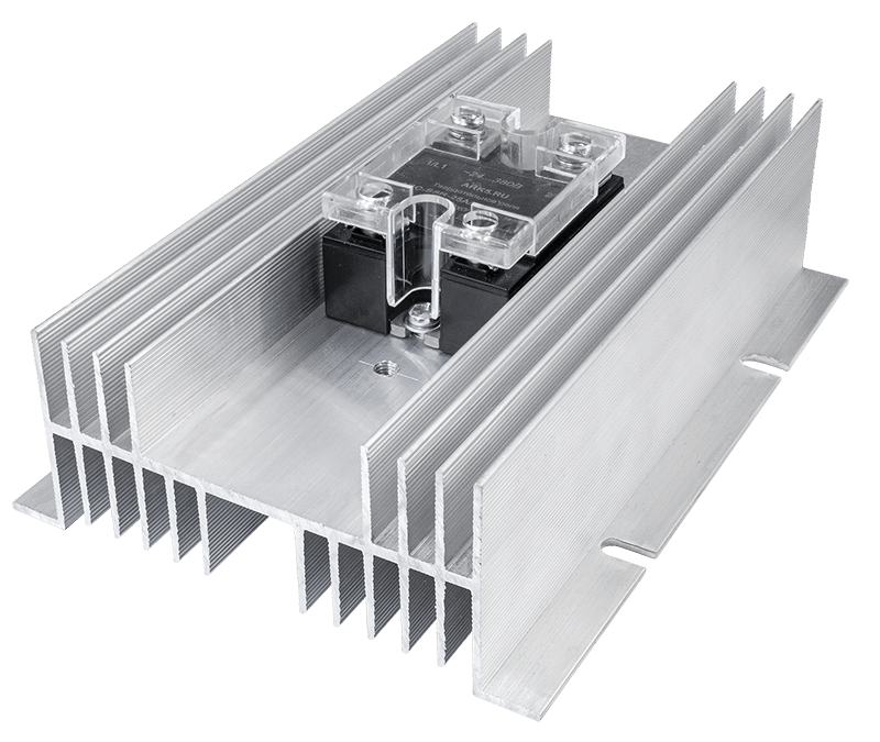 Радиатор AR-SNT-1260. При подборе радиатора для SSR необходимо учитывать, что не существует однозначного соответствия мощности SSR и типа радиатора: на охлаждение влияет много параметров: температура окружающего воздуха, нагрузка SSR, поэтому необходимо брать радиатор с запасом мощности и/или усиливать теплоотвод с помощью вентилятора